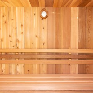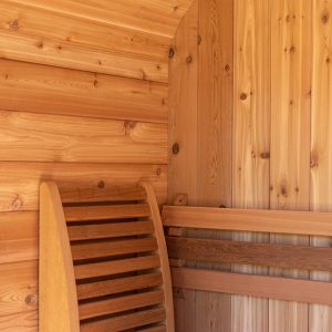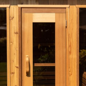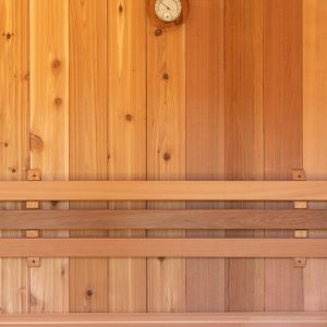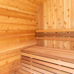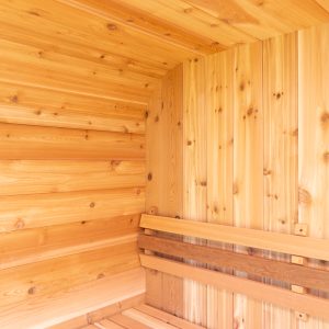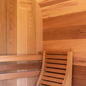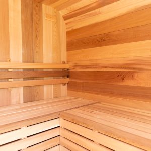 Totalmente fabricada no nobre cedro liso canadense, a sauna Luna apresenta bancos longos e espaçosos, além da parte frontal em vidro, permitindo contemplar o ambiente ao redor enquanto se relaxa na sauna.