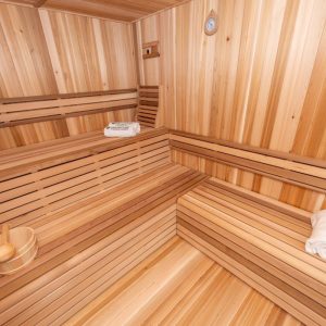 Esta espaçosa sauna em madeira é uma verdadeira declaração de elegância e modernidade, complementando e exaltando tudo ao seu redor.