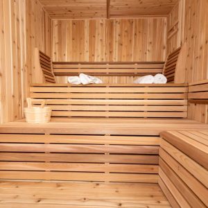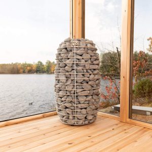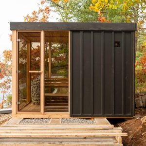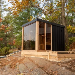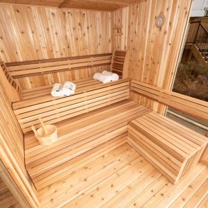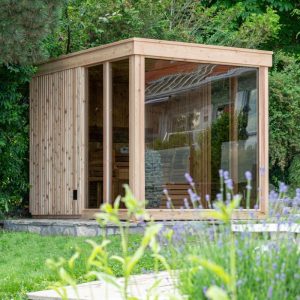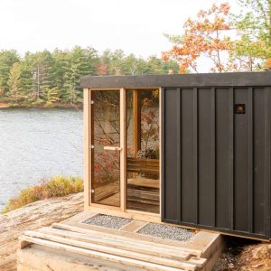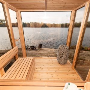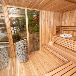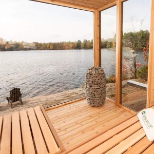 A sauna pronta outdoor Orion possibilita uma conexão ímpar com a natureza externa, devido ao seu amplo vidro bronze frontal e nas laterais. É uma sauna em madeira muito imponente e bem ampla, para curtir com a companhia de amigos e família. Ela ainda conta com o benefício de ter piso, paredes e teto totalmente isolados termicamente, assegurando alta eficiência energética.